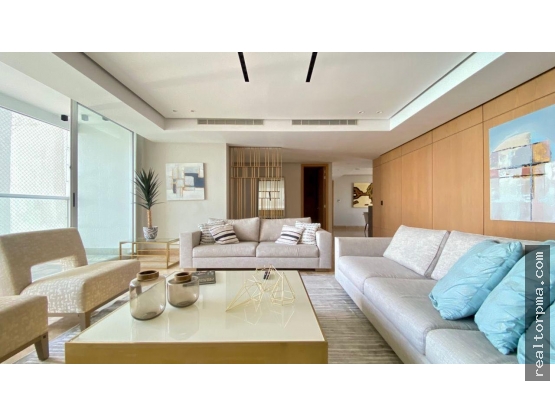 Fully furnished 307 m² apartment in Punta Pacífica with 3 bedrooms, 3.5 bathrooms, family room, balcony, maid’s quarters, and 2 parking spaces.